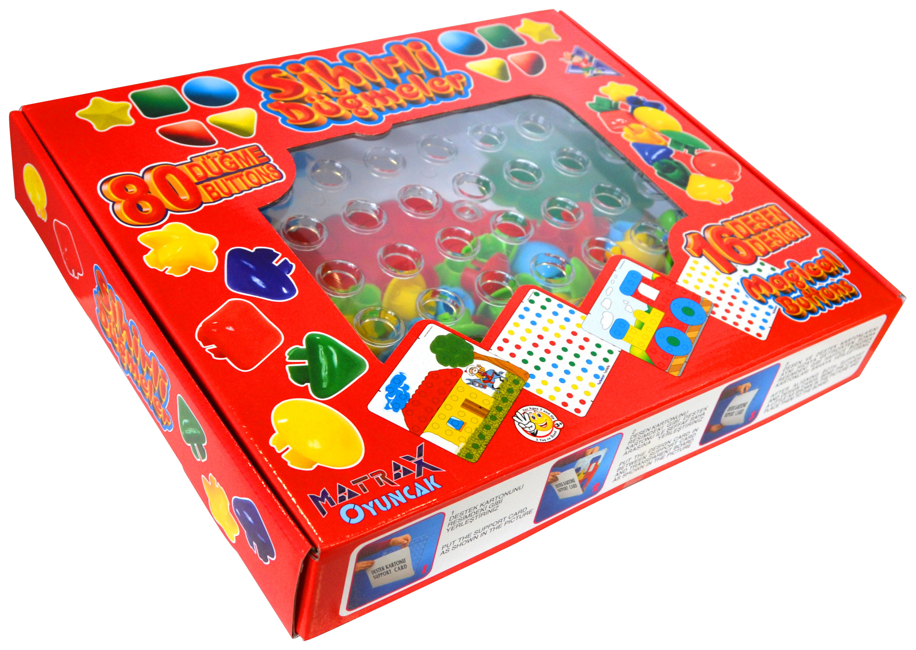 Ürün paketinde 80 adet büyük kırılmaz düğme, çift yönlü 8 adet kart ve toplam 16 adet desen bulunmaktadır.